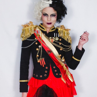 "The Future" look of Cruella is edgy, fun and affordable to do if you need a quick costume in your arsenal. The only thing I recommend getting is a wig to "complete" the look. The plus side is, Cruella can be paired with many looks, so you will always have many options and lots of use of your wig in the years to come! The Future costume consisted of a leather jacket, sequence gold pants, boots and an almost "Joker-ish" painted on mask! That's it, simple but edgy, brownie points if you ride a motorcycle or know someone who could help you make an entrance at a party, just like the film!
