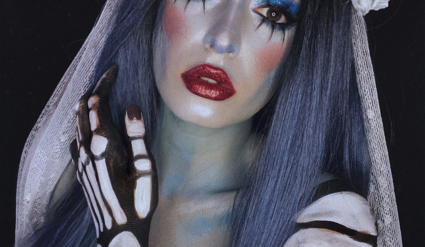 The Corpse Bride shines through but Laura is keeping it original with her spooky editorial glam face and then popping in the painted skeleton arm to seal the gothic look.