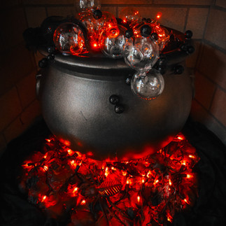 * Please note that below I am showing you two types of cauldrons below. One that we decorated with bubbles and fairy lights, while the other is the fogging style (you can find also in out Amazon Cauldron DIY list)! For the last four years, my sister and I have planned Halloween decor for our family's business and this year was witches. So I was able to make two sets of ember burning pieces and try a fogging style cauldron. The bubbling one I made for my mother's home is to match her goth glam pieces she has collected over time...
