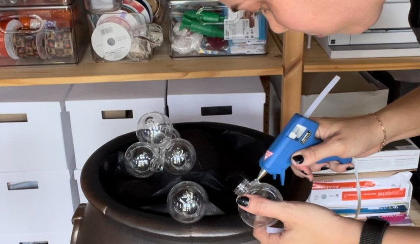 Now begin the bubbles. Start with a few clusters and then add in the rest. Glitter spheres and gauze fabric material. I then hid the battery case of the fairy lights under a small piece of black gauze fabric, adding more texture and layer and was able to only allow the glowing orange lights intertwine with the clear plastic Christmas ornaments.